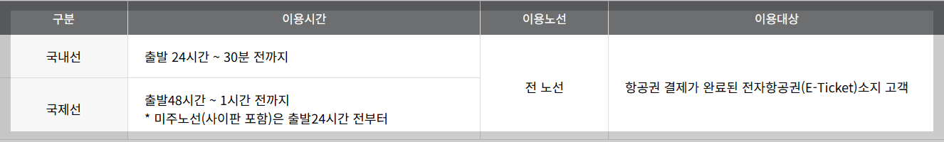 -국제선은 출발 48시간부터 1시간 전까지 이용이 가능하다. (단, 미주노선(사이판 포함은) 출발 24시간 전부터 가능하다.