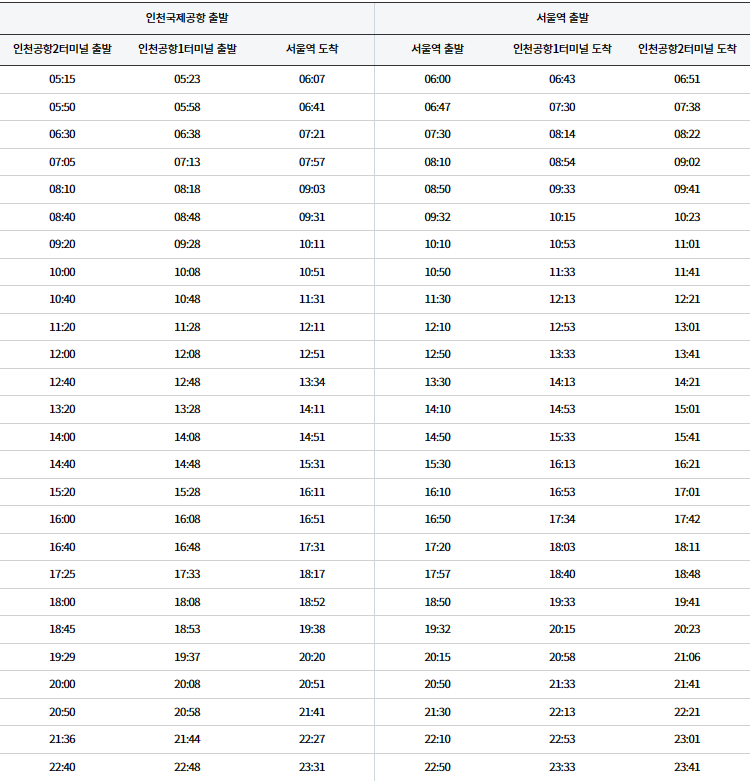 | 인천공항2터미널 → 인천공항1터미널역 → 서울역 | 서울역 →인천공항1터미널역 →인천공항2터미널역 |